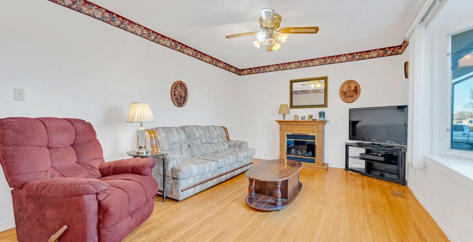 Bright living room with electric fireplace, natural light, hardwood flooring and a ceiling fan -- all you need to relax.