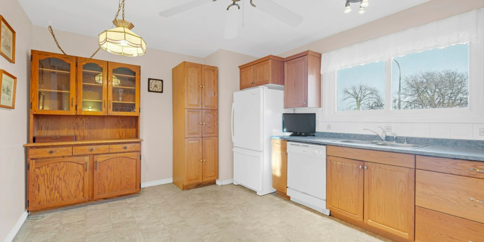 Spacious eat in kitchen, with dishwasher, refrigerator, an abundance of cabinetry, counter space and pantry and light floors is functional for family food prep and meals.